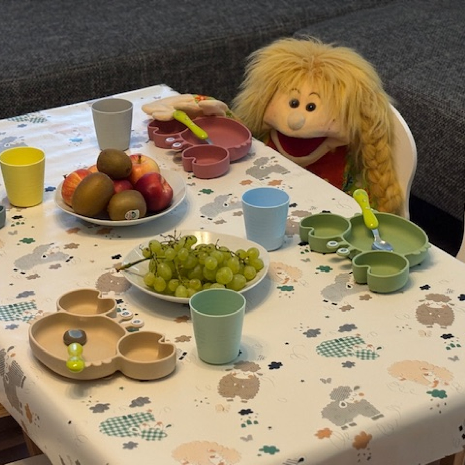 Für den Mittagsschlaf oder um sich auszuruhen gibt es den Schlafbereich mit einem eigenen Bettchen für jedes Kind. Die Küche ist besonders wichtig: hier bereiten wir – auch oft gemeinsam mit den Kindern – die Mahlzeiten zu und lassen es uns zusammen am großen Tisch schmecken. In den Räumen gibt es verschiedene Bereiche zum Bauen und Spielen – mache Bereiche werden auch für verschiedene Anlässe umgeräumt.